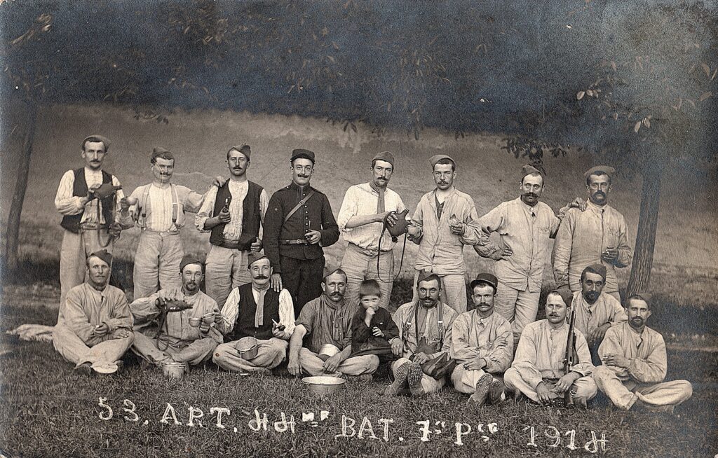 Dans les villages du département du Rhône, c’est la fête pour les jeunes garçons qui, après le recensement, le tirage au sort et le conseil de révision, sont reconnus « bons pour le service ». Ils viennent de subir, avec succès, le rite qui marque le passage de l’enfance à l’âge adulte. Eux ou leur famille achètent aux marchands ambulants, qui suivent l’itinéraire du conseil de révision dans le département, les accessoires indispensables : cocardes, chapeaux, cravates tricolores.