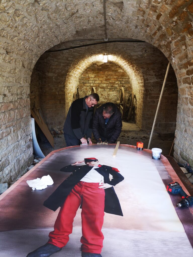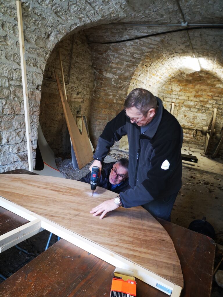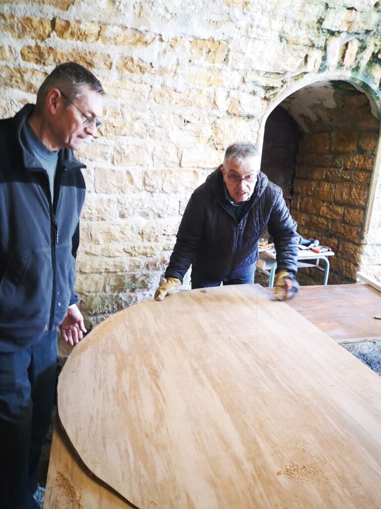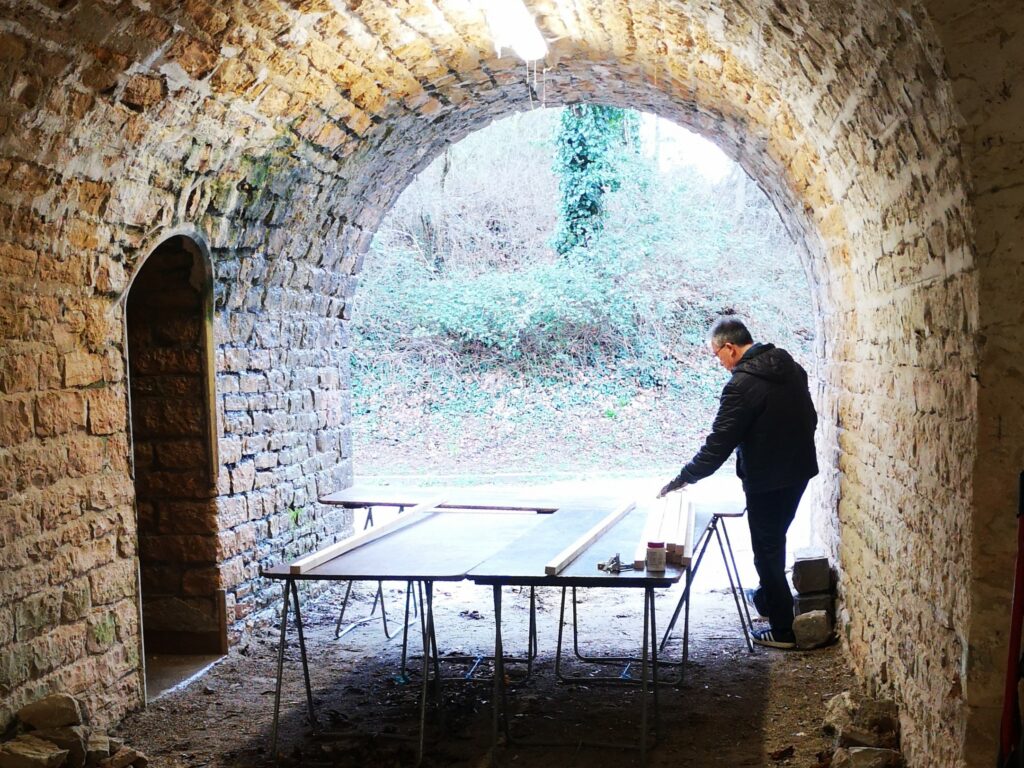 Session 28/01 : Nettoyage au burin des murets des box / Consolidation du coffrage pour le coulage de la semelle du muret des pissotières à la mousse polyuréthane /