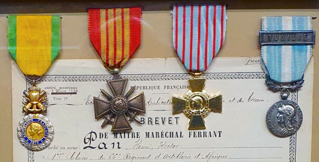 Un ensemble de fers pour les équidés accompagné des médailles du Maitre Maréchal Ferrant – Un don de la famille Pan. Pour en savoir plus —->