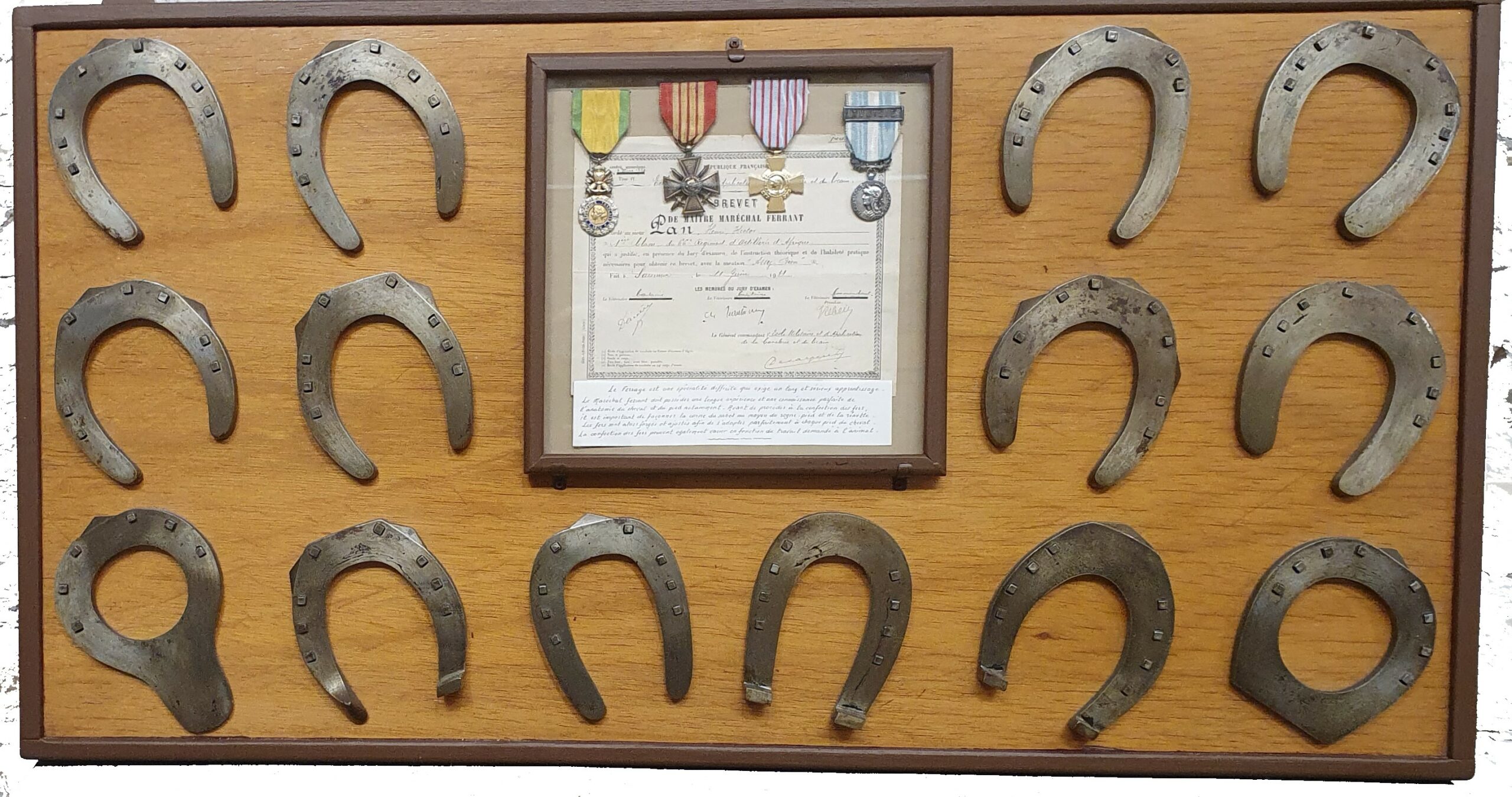 Un ensemble de fers pour les équidés accompagné des médailles du Maitre Maréchal Ferrant – Un don de la famille Pan. Pour en savoir plus —->